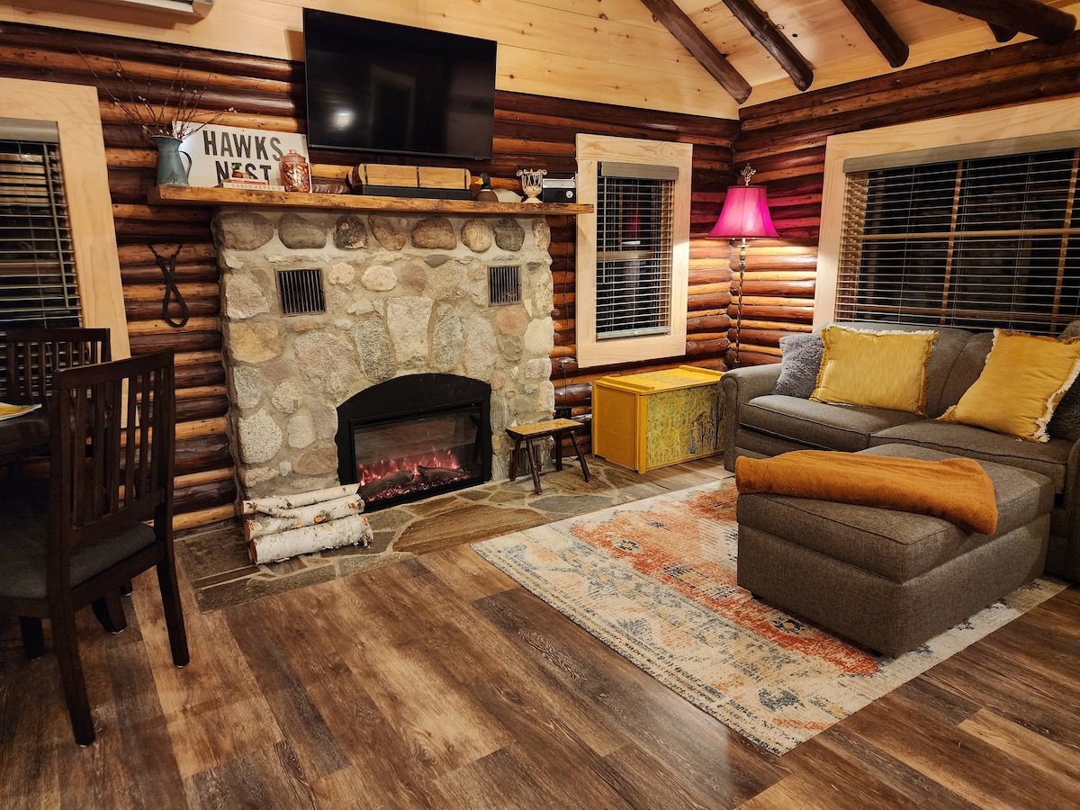 Enjoy the coziness of a bygone era while staying in this 1940s quaint, storybook log cabin. The Hawks Nest has been lovingly restored to its original glory while having all the modern-day amenities woven through its clean 380 sq. ft. space. Retreat to the spacious covered porch to relax and view the acre-and-half property leading down to 100ft of 6Mile Lake frontage. Star gaze while relaxing in the comfortable, Amish-built gilding chairs around the spacious, paver fire pit area .