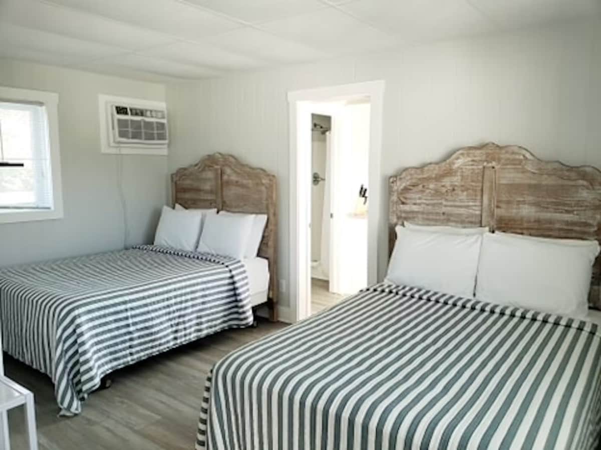 This classic motel room includes 2 queen beds, small seating area, and 1960’s original tile bathroom with tub and shower - all surrounded by nostalgic art and vintage furnishing. It doesn’t get more retro-vibe than this. Motel Bear Lake is a woman-owned, pet-friendly motel with modern amenities and a seasonal pool. Located only steps from Bear Lake Beach and only 15 mins from Frankfort and Manistee.