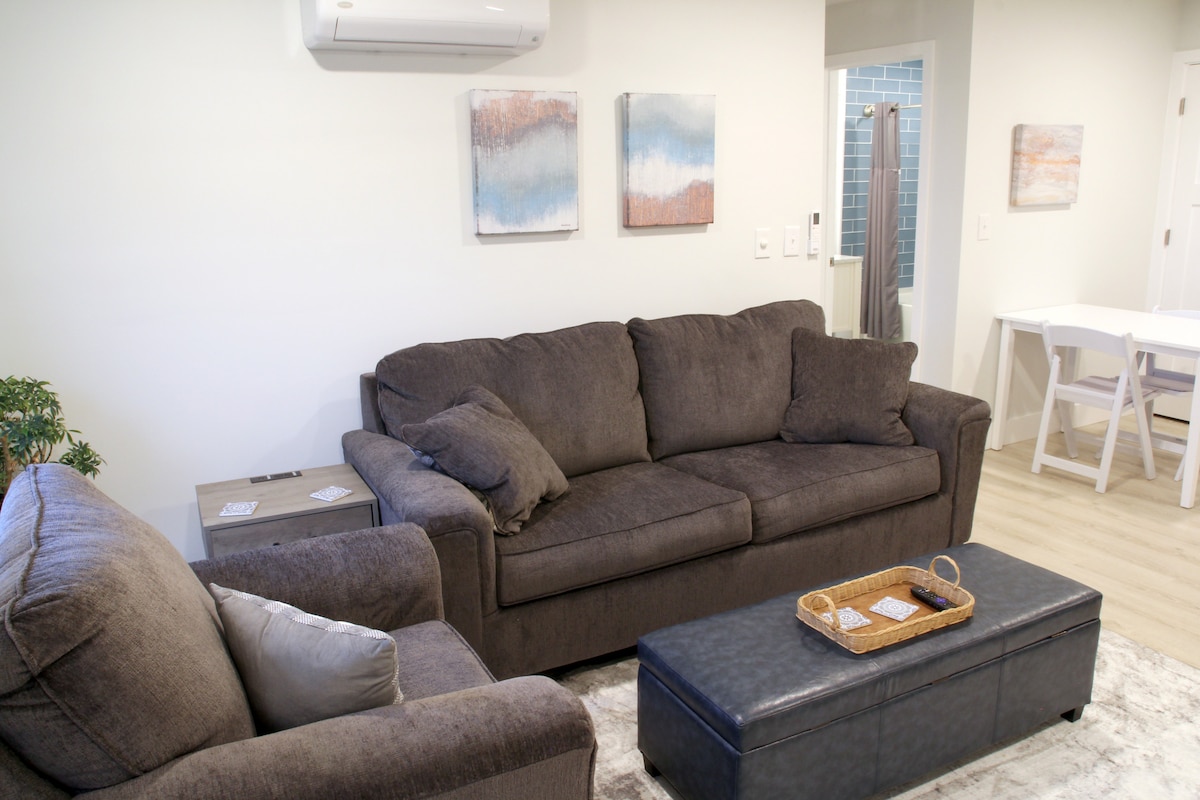 Everything you need to relax & recharge in one cozy space. Private entrance. This suite is an open floor plan with a small kitchenette that includes a fridge, microwave and stove with basic kitchen utensils and dishes. It is located in town close to stores, restaurants. Nice patio out back with covered area to grill out. Walking distance to the North Country Trail and 10 min from the new Dragon trail. There is one queen bed and a couch. It will comfortably sleep two guest.