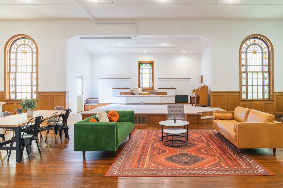 "The Seven Bridges Chapel" is a former church that has been renovated and updated to include every comfort, while still maintaining historic "church" elements such as stained-glass windows and original maple floors. No detail was overlooked during the renovation of this historic building. With two full bathrooms, a well stocked kitchen, laundry room, one bedroom with sitting area, loft and 2000 square feet of living space, we think the Chapel is an amazing option! SEE "OTHER DETAILS".