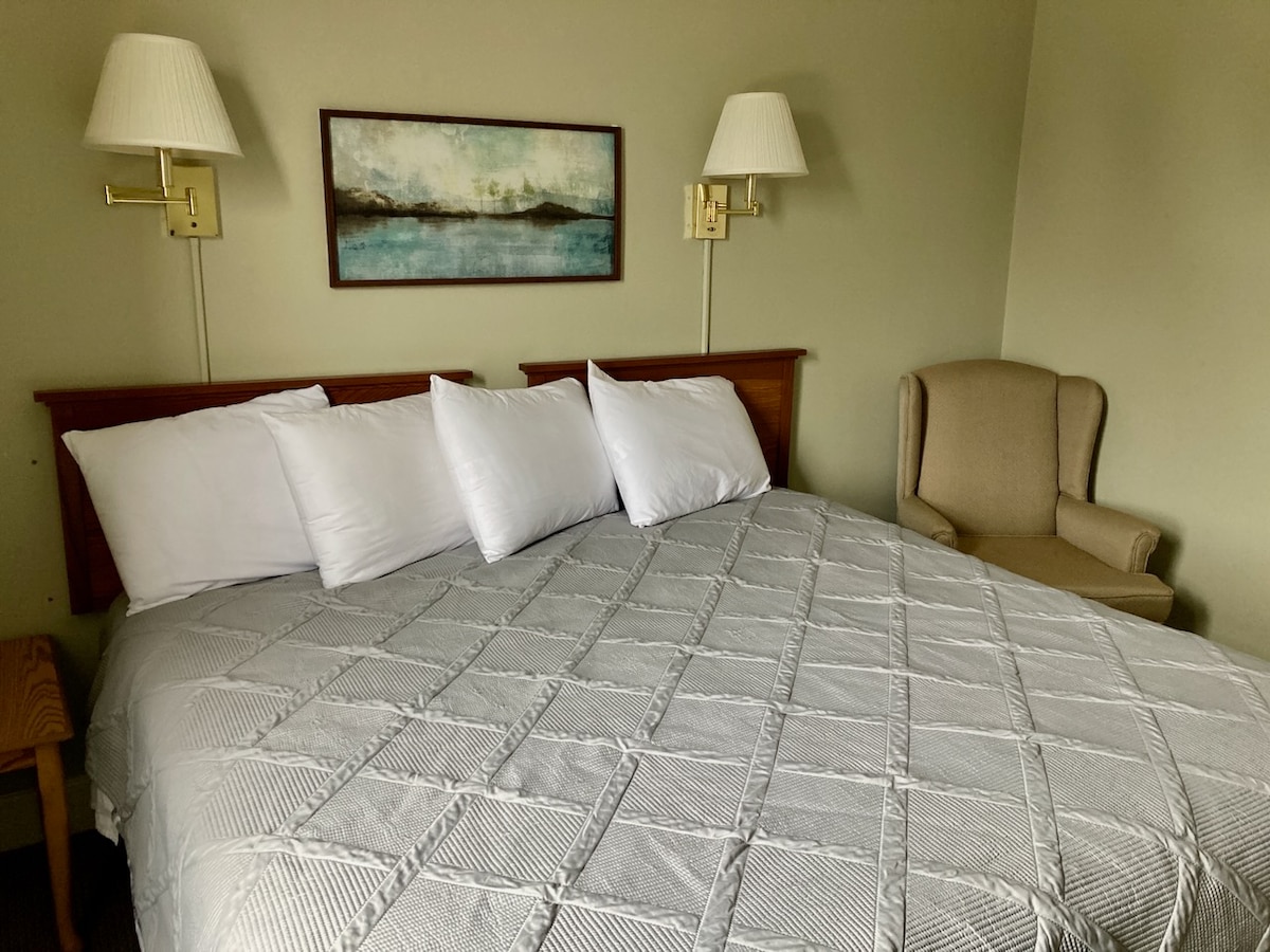 Enjoy a peaceful stay in this simple room in a former Catholic retreat house. Double bed, desk, chair, in-room sink. Men's and ladies' shared bathrooms with separate shower rooms down the hall. Free Parking. Self-serve complimentary breakfast snacks in the dining room. 40 acres of woods and trails to explore. Easy self-check-in. Close to Kitch-iti-kipi and Fayette Ghost Town. Sand beaches at Fayette and Garden Corners. Golf course nearby. A coffee shop is onsite. Variable seasonal hours.