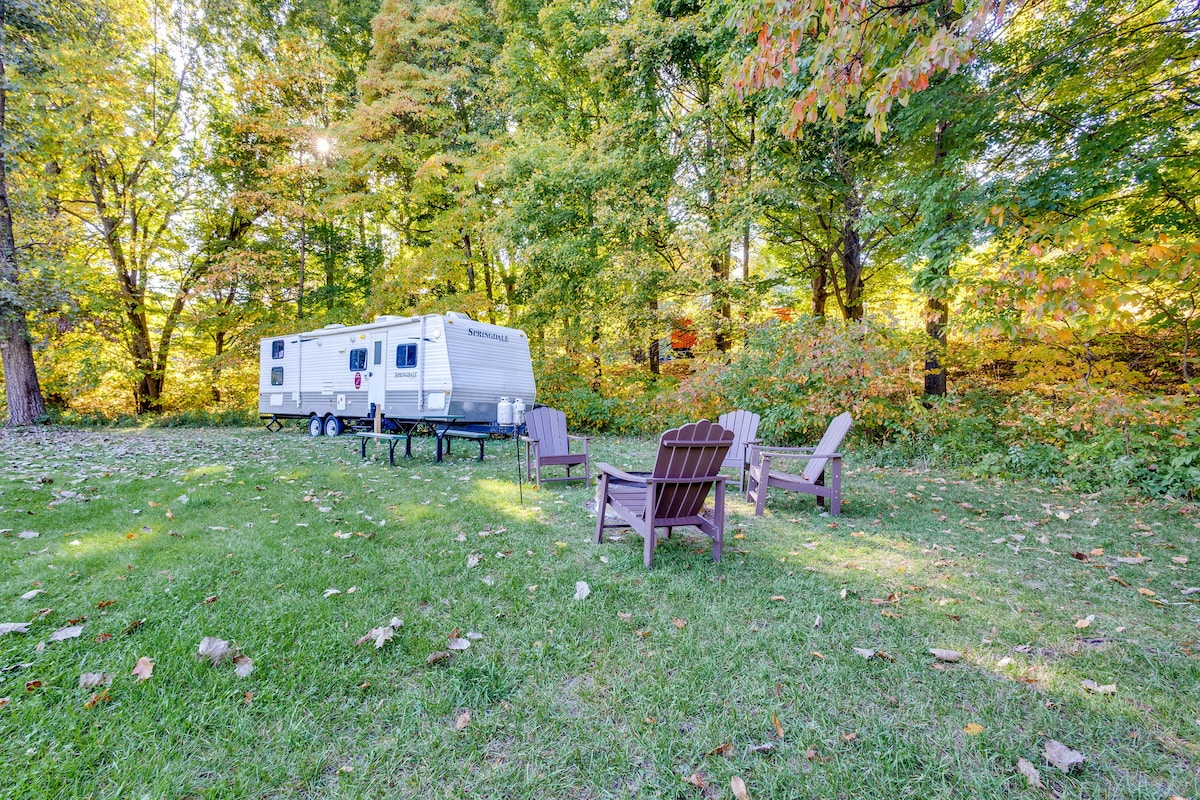 Where tourism meets nature! Enjoy private Northern Michigan camping in a 36 ft travel trailer with bunkhouse and outdoor kitchen on a beautiful wooded lot. Everything you need is provided. This private campsite, just off the beaten path 10 minutes from the Cheboygan Inland Water Ways, Historic Mackinaw City, Mackinaw Island ferries! Come and witness the Northern Lights and enjoy your own dark skies just minutes away from the busy city! Your Northern MI vacation starts here.