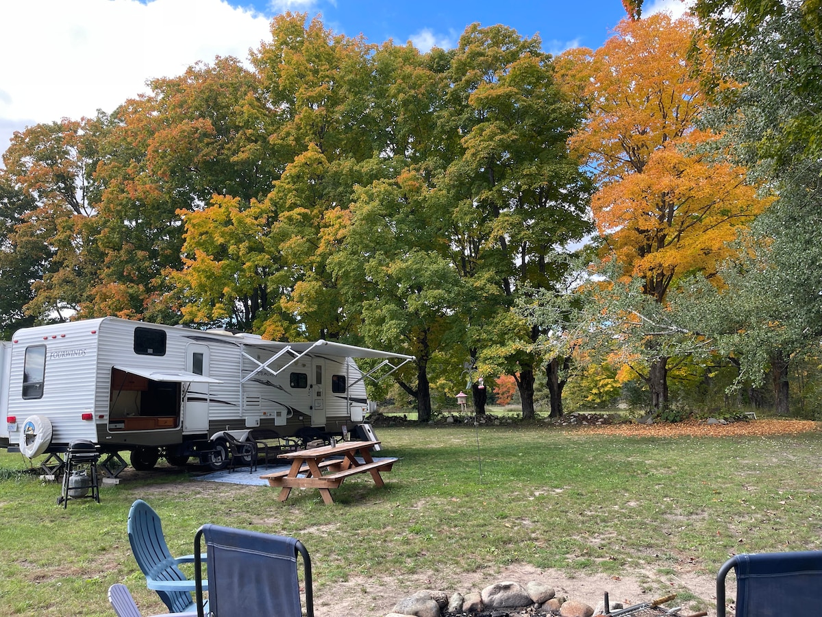 Where tourism meets nature! Enjoy private Northern Michigan camping in a 36 ft travel trailer with bunkhouse and outdoor kitchen on a beautiful wooded lot. Everything you need is provided. This private campsite, just off the beaten path 10 minutes from the Cheboygan Inland Water Ways, Historic Mackinaw City, Mackinaw Island ferries! Come and witness the Northern Lights and enjoy your own dark skies just minutes away from the busy city! Your Northern MI vacation starts here.