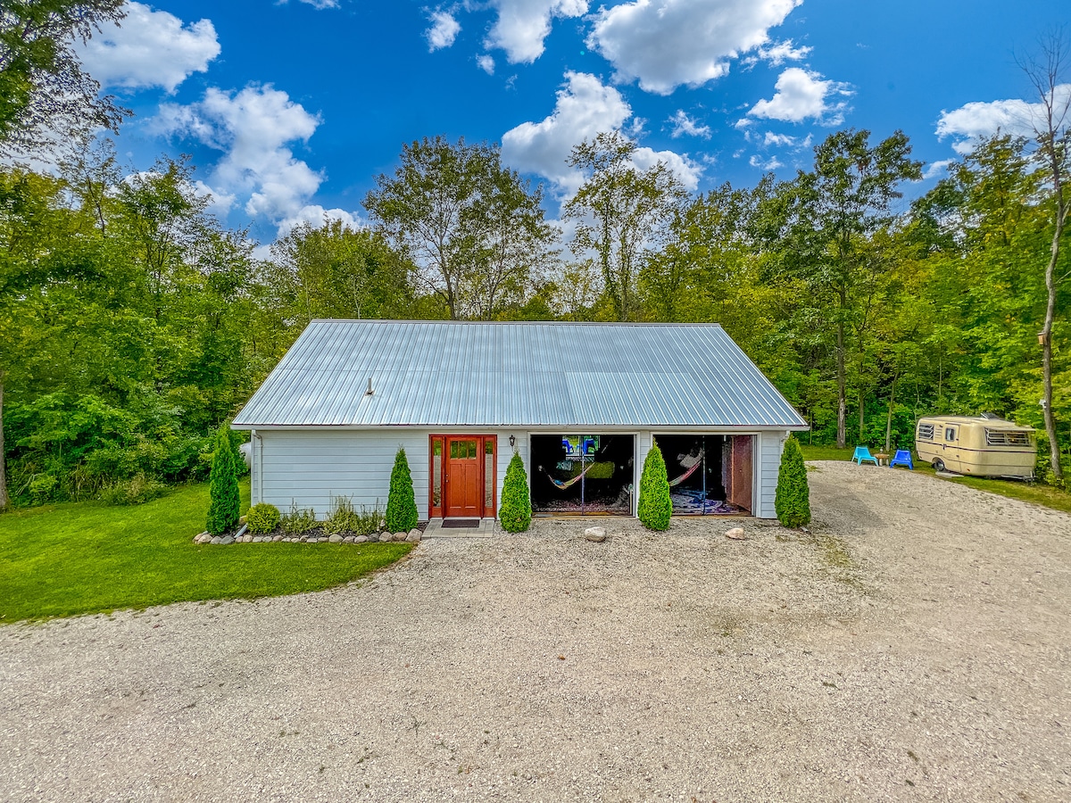 Boho/Industrial romantic getaway - 2 levels, 6 wooded acres. Indoor hammock & 2 garage screened doors opening to the outside(seasonal) Open plan sleeping spaces w/queen bed & 2 futons upstairs. Outdoor fire pit, hot tub, 2 bicycles. Vintage 1973 Trillium camper@ extra $50/day w/cabin rental only. Antiques, restaurants, Mt. Holly Ski Resort, Pine Knob Concert & Ski/Snowboard Resort, wedding venues, Heather Highlands Golf & Holly Oaks Park all minutes away. Angel wings photo op mural.