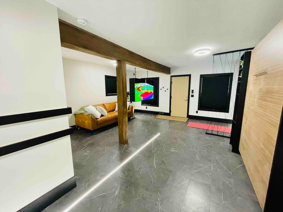 For our third experience, we truly wanted to create a boutique penthouse experience in a home. Instead of spending $500 for a hotel room, we wanted to curate a space that stands alone for less. Rest up or come alive by relaxing in the spa like washroom injected with a sauna and rain shower Relax or energize by setting the lights to unlimited auras with the touch of a button Meditate or workout in front of 4K nature videos on a vertical 85” TV Enjoy a bonfire Welcome to LNSNG LXRY III