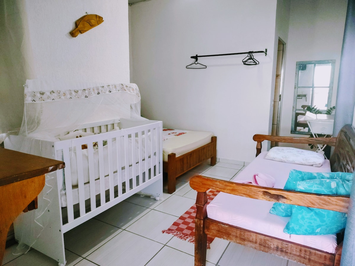 Linda casa com uma vista privilegiada para o mar e para praia protegida em meio a natureza.Uma das poucas que possui ar condicionado.A estrada acaba na praia da vila em meio a ranchos de pesca local.Acesso à casa feito a pé pela praia,30 metros 1 suite casal(cama queen) 1 suite solteiros -1 cama e mezanino-3 pessoas 1 quarto de casal (cama queen) 1 banheiro que alimenta o quarto de casal Sala com vista para o mar Varanda com vista(ganchos para 2 redes) Estacionamento para 1 carro