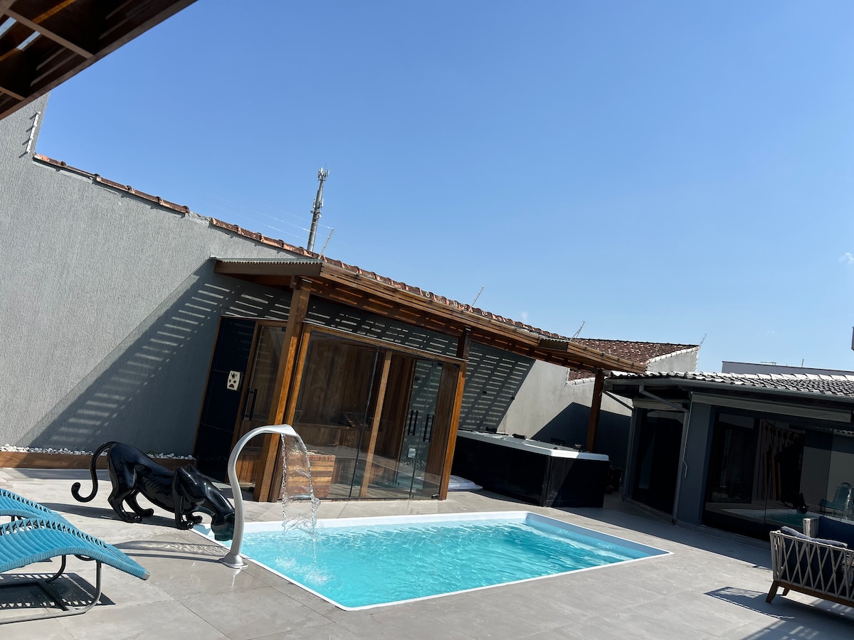 This brand new house sits high above the trees inside the Aldeia Rizoma eco village, a gated property 15 minutes away from the city historical center. The property offers a jungle gym, sauna (paid as an extra), private trails and access to 5 private waterfalls. The one bedroom studio has a king size bed built high so you can watch the forrest from it. It offers a private hot tube and a fully equipped kitchen. There is an extra bed that can be used for a third person with an extra fee per night
