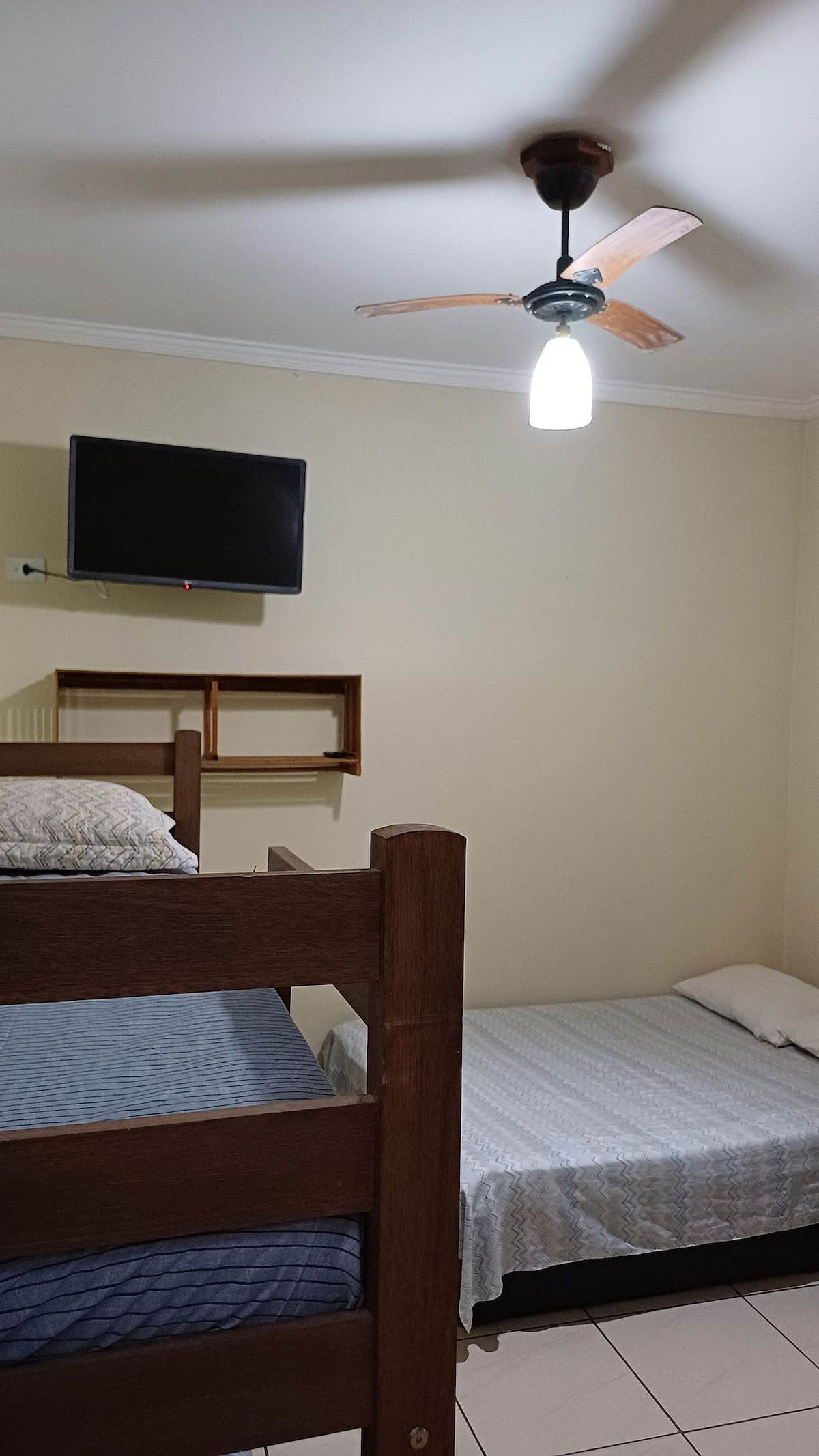 Ambiente Familiar a 500 mt da Paria do Perequê Açú.. Suíte Confortável. Localizada no piso Inferior. Cama box de casal + Beliche + cama auxiliar. Ventilador de teto , Smartv , mesa com cadeiras , frigobar, banheiro exclusivo , wi-fi de qualidade.3 mercados com padarias,açougues,hortifruti a menos de 50 mt. Local adequado para seu apoio na ida e volta de seu passeio de Praia ou a negócios.
