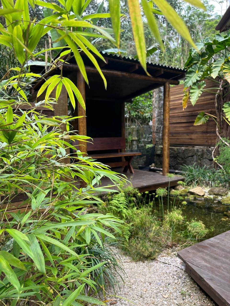 Um bangalô construído artísticamente em cada detalhe...banheira aberta para a mata com teto de vidro passam a sensação de estar imerso na natureza, com uma Figueira centenária de frente e muitos pássaros...intimista e acolhedor em conexão com a Natureza em contato com essa área de reserva da Mata Atlântica. O outro chuveiro quente fica no deck aberto para a mata e é delicioso de dia ou à noite com céu de estrelas e Luar.