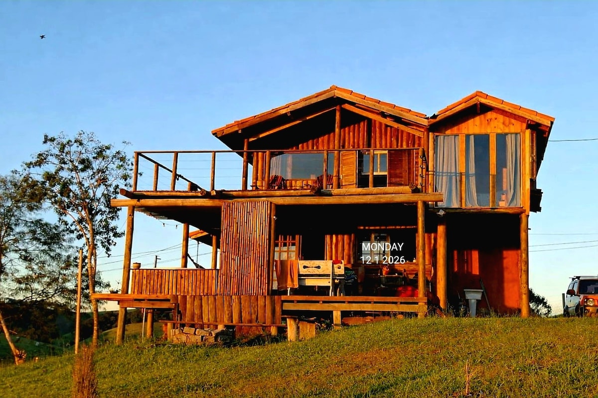 Você jamais esquecerá dessa experiência exclusiva e exótica neste destino rústico de madeira no alto das montanhas. Chalet encantador. Que tal relaxar no spa ofurô com hidromassagem apreciando champagne, ou nas redes ou bancos tomando vinho com maravilhosa vista do pôr do sol 220m² de área construída: 110m² área interna e 110m² de 2 decks Andar inferior: ampla sala, cozinha americana, 2 banheiros e amplo deck com ofurô Andar superior: 2 quartos grandes, deck superior, rede horizontal @montjacui