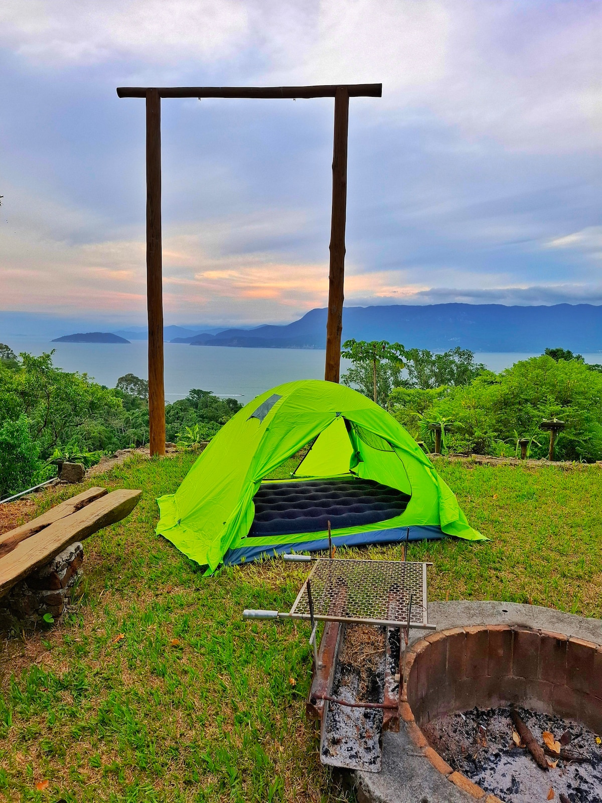 Glamping dos Sonhos é uma experiência campista perfeita para casais ou solo. OFERECEMOS 1 BARRACA GRANDE E COLCHÃO DE CASAL COMO NAS FOTOS que se pode andar em pé dentro, em um visual vislumbrante. E você não precisa montar nada! A ideia é acampar com conforto, tranquilidade e privacidade em um local seguro e em total contato com a natureza . Oferecemos chuveiro quente, mesa de pic-nic, área para fogueira e a vista privilegiada de nosso mirante panorâmico de frente para o mar.