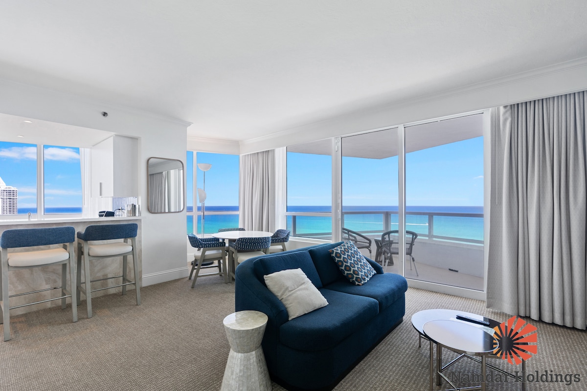 Rarely available Large One Bedroom Ocean Suite located in the Sorrento tower 1000 sq ft with private balcony. Entire apartment with full kitchen and 2 full bathrooms and Jacuzzi bathtub in master. One King Size Bed One Full Size Sofa Sleeper Cot available from the hotel for a fee Cleaning NOT included. There's a $205 + tax mandatory cleaning charged at check out. Mandatory Security deposit $250 a night REFUNDED after your stay. Free VALET