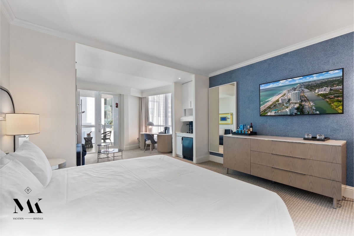 Discover luxury in our Miami Beach studio at the Sorrento Tower at Fontainebleau Miami Beach Hotel. This junior suite boasts stunning views of the beach, ocean, and the hotel pool area. Enjoy full access to hotel amenities: gym, restaurants, Lapis Spa, and more. Features include a king bed, sleeper sofa, internet, kitchenette, coffee maker, utensils, linen and mini fridge. Sunbeds and towels in pool and beach use are included, ensuring a comfortable and memorable stay.