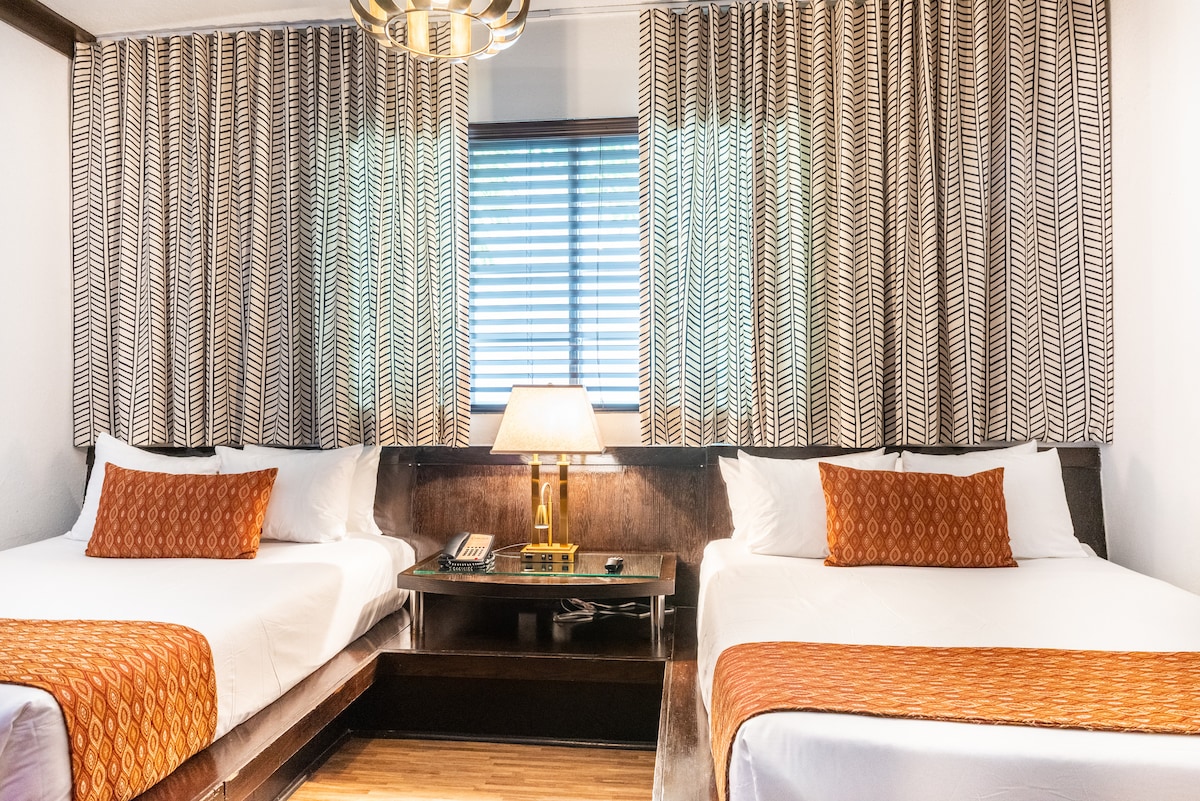 Double Queen bedroom at Hotel Trouvail Miami Beach, just one block from the ocean in the stylish Faena District. Perfect for up to four guests with two queen beds, walk-in rain shower, flat-screen TV and mini fridge. Enjoy food, coffee, or cocktails at the café, bar, or pool. Nestled in a quiet area that’s still steps from South Beach’s best dining, shopping, and nightlife—but just not the noise, traffic, and crowds. Ideal for a relaxing stay or work trip.