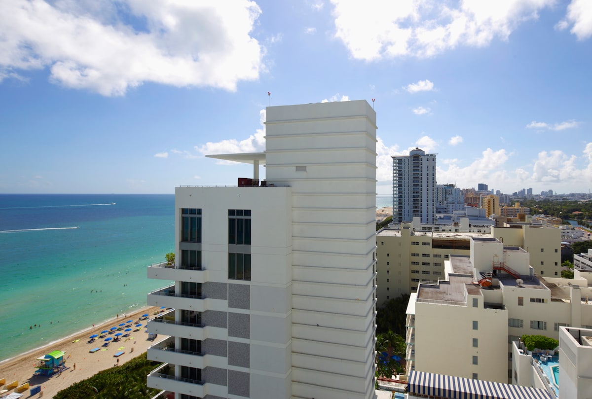 Welcome to Pure Miami Beach! Escape to this modern beachfront studio in sunny Miami Beach, Florida, with breathtaking 180° ocean views. Relax in a plush king-size bed, stream on a 65” 4K Samsung TV, or work with private 300mb WiFi and ethernet connections. Stay fit in the renovated gym, then unwind by the sparkling pool with direct beach access, lounge chairs, and a tiki bar for tropical drinks and bites. Free parking, luxury finishes, and endless ocean vibes make this the ultimate getaway!