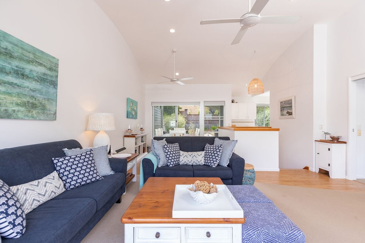 Our home is the perfect spot for your next holiday. It boasts a beautiful kitchen with loads of space and walk in pantry. The kitchen is fully equipped with dishwasher, microwave and other handy kitchen appliances, tea, coffee and sugar. Bright and airy the home has an open plan lounge/dining area to relax in and opens on to a side deck and spacious landscaped front courtyard with BBQ. It boasts 3 upstairs bedrooms with main bathroom and downstairs bedroom with ensuite, 3rd toilet in laundry.