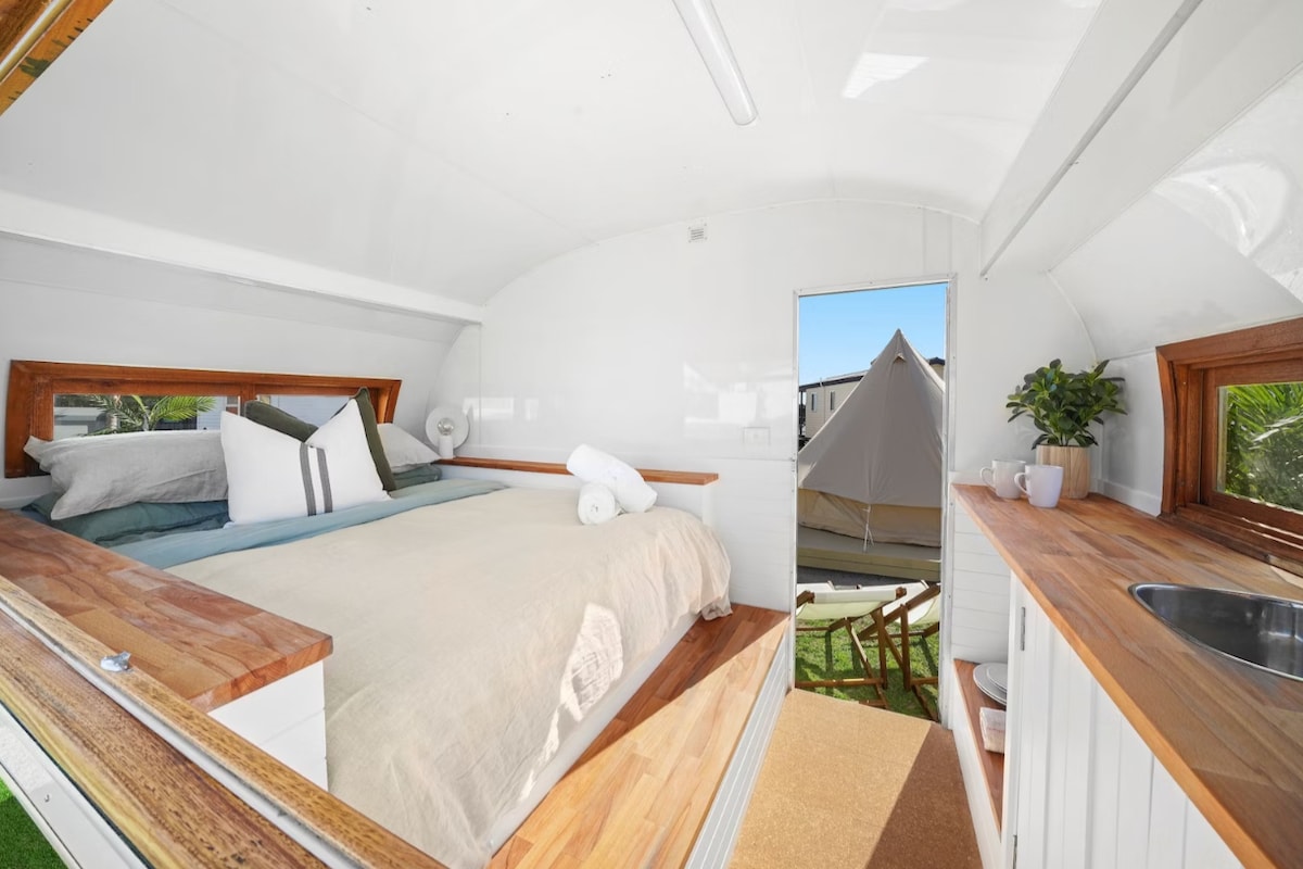 The Blue Van has been lovingly refitted with a queen bed and a king single, smooth timber floors, a fan for warm days and a heater for chilly nights. All bedding is provided, so just bring yourself and unwind. Guests enjoy full access to the camp kitchen and amenities block with hot showers and flushing toilets, plus all retreat facilities including the heated magnesium pool, sauna and yoga deck (additional costs may apply) **$15 per night pet fee