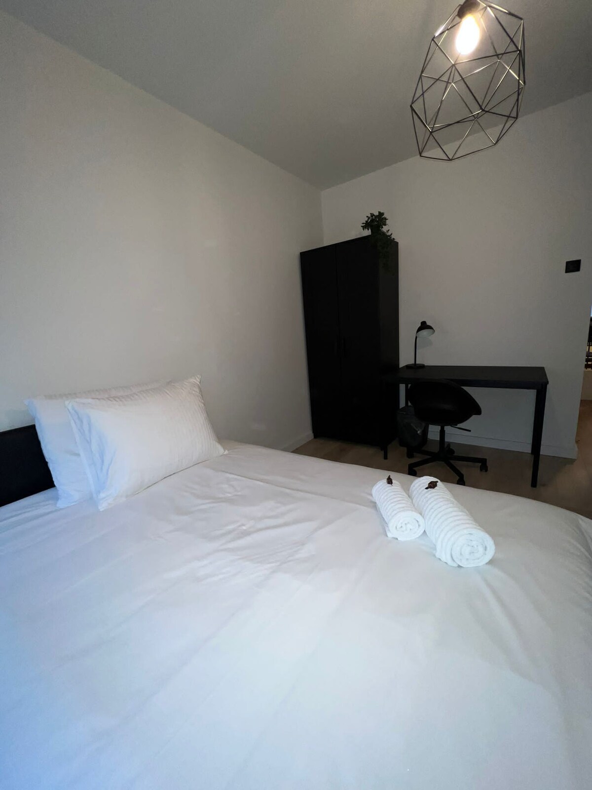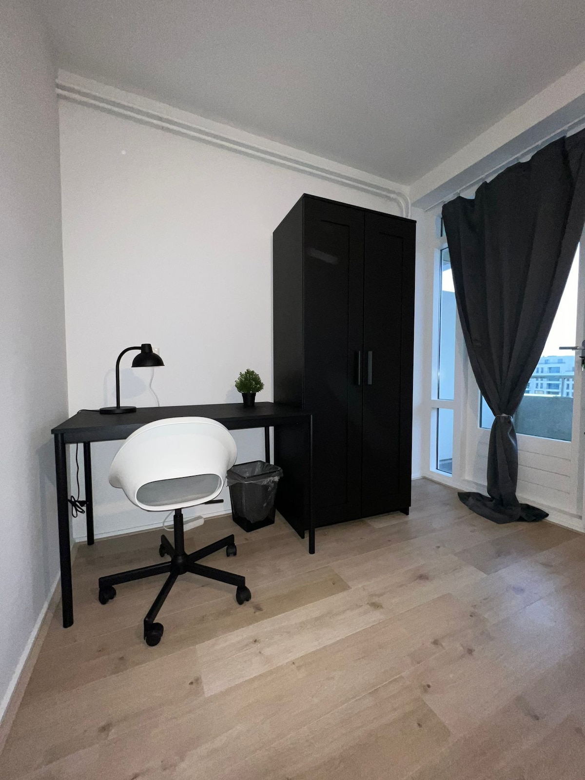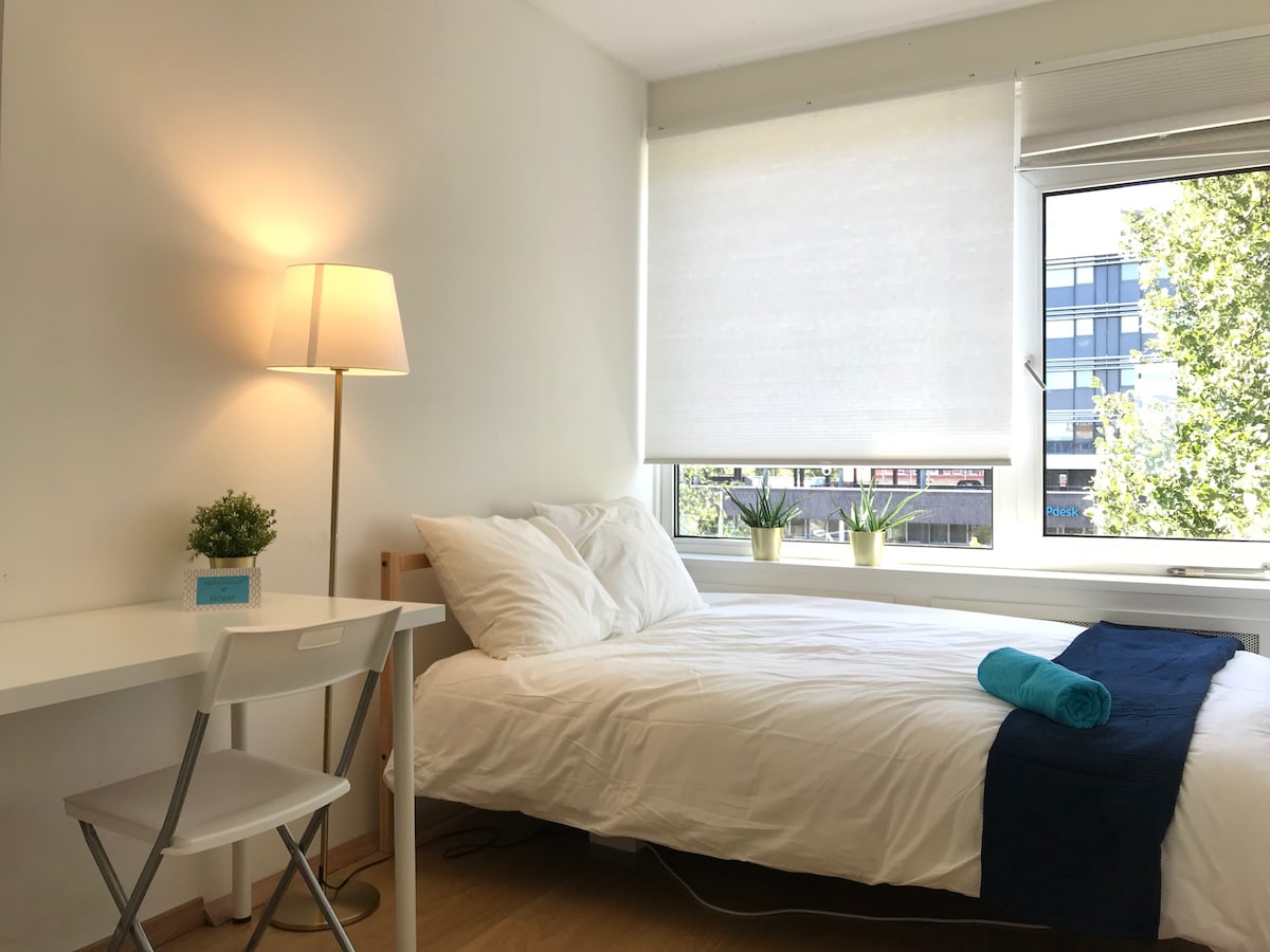 A neat furnished bedroom for one neat lady in a clean apartment. Room has a beautiful view of the center of Schiedam. 10 min walk to Schiedam central station. 1 min walk to the tram directly to Rotterdam Central station and centrum. 10 min walk to the Schiedam shopping mall. Room now has thick curtains to darken the room in sleep time! You’ve access to a neat furnished bathroom, toilet and kitchen.