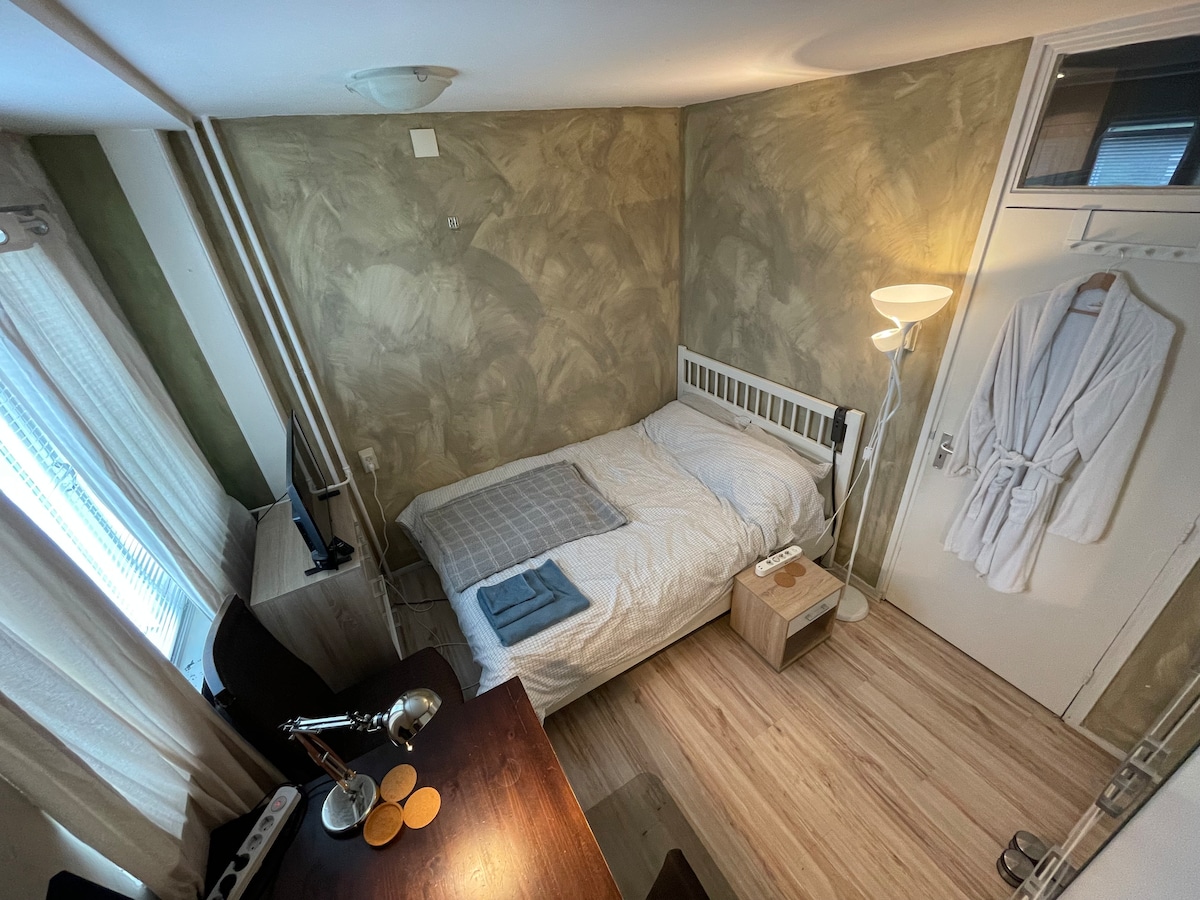 Gezellige kamer (16m2) in het centrum van delft op 50 meter afstand van de markt. Uitzicht op de gracht met winkels en horeca. De kamer heeft een eigen badkamer, werkplek tweepersoons bed. De kamer ligt op de eerste verdieping en deelt de entree en hal met het hoofdhuis. Let op: door de ligging in het centrum kan er in het weekend geluidsoverlast zijn van uitgaanspubliek.