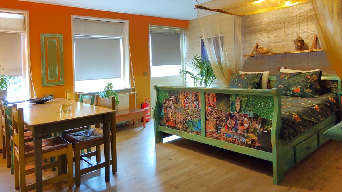 Sfeervol en kleurrijk verblijf, geïnspireerd op de kleurenpracht van India voor degenen die eens iets anders willen dan standaard. Gegeven prijzen zijn incl. toeristenbelasting Met ontbijt ook mogelijk voor €11,00 p.p.p.d. Totaal 48m2 Onderdeel van minicamping en glamping Buitenwereld Gelegen op de begane grond, huisdieren welkom, rolstoelvriendelijk Het verblijf heeft een nieuwe grote badkamer met wc, douche en wastafel en beschikt over een eigen ingang en een ruime tuin op het zuiden.