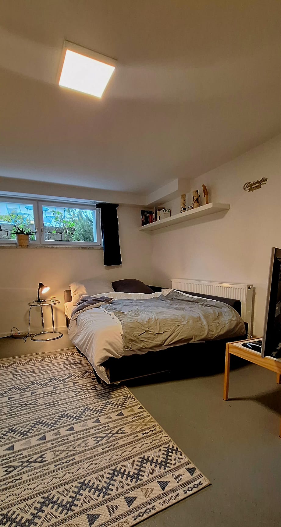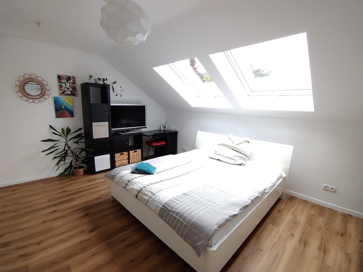 Dachgeschoßzimmer mit eigenem Bad. Wasserkocher, Toaster und Senseo Kaffeemaschine, Geschirr für 2 Personen vorhanden. Fahrräder können ausgeliehen werden. Bushaltestellen, Bäcker, Metzger in unmittelbarer Nähe. 10min mit dem Bus zum Zentrum. S-Bahn und Autobahn schnell erreichbar.