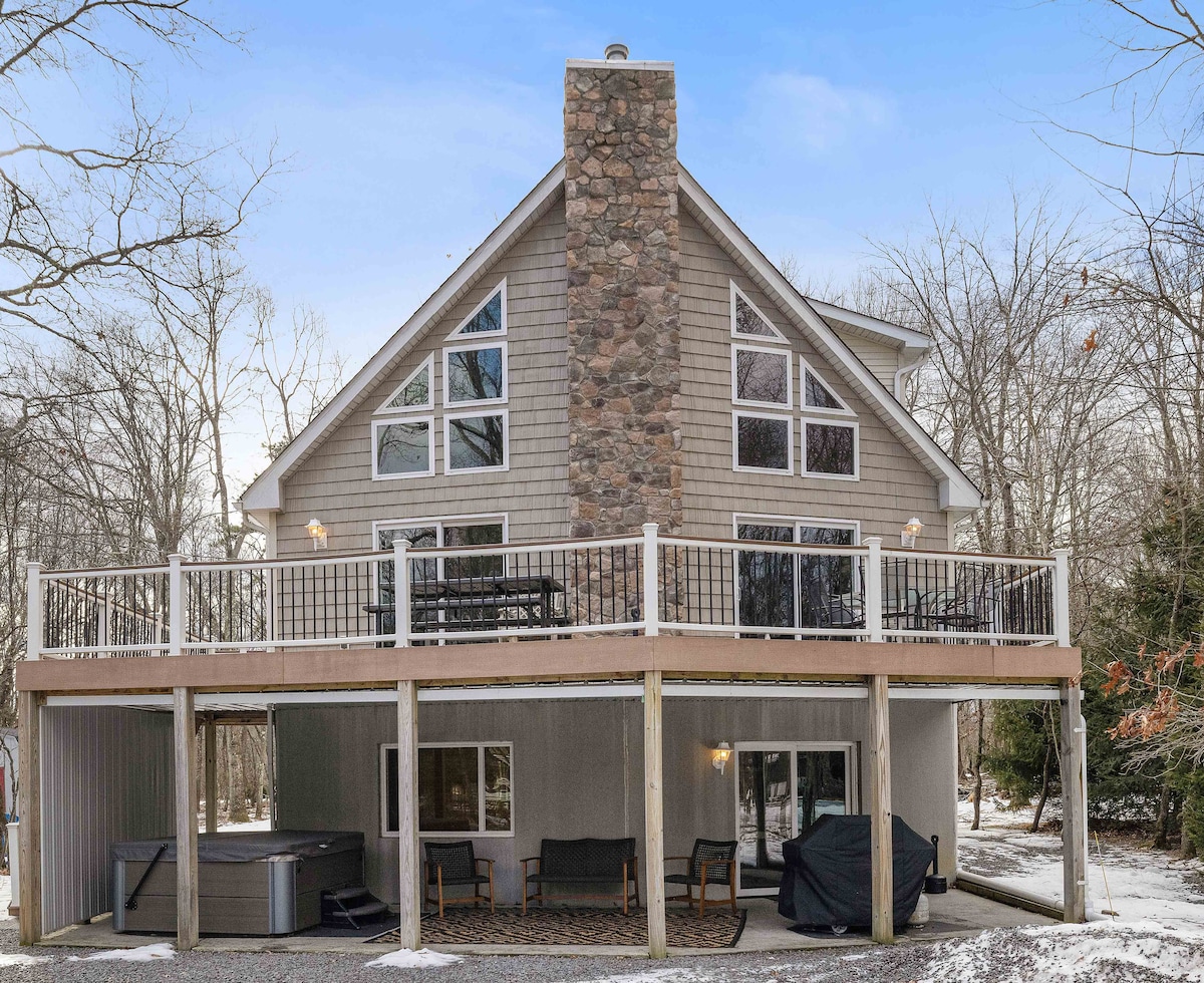 New 7 SEAT HOT TUB! In the heart of Pocono Mountains a newly renovated, modern, spacious & family-friendly chalet in an amenity filled community Private 3000sqft 4bed3bath home located on 1.5acres backing up to a nature preserve Enjoy the sauna, hot tub, game room, fireplace, fire pit We are in a community with 5lakes, 3beaches, fishing lake, 2pools, playgrounds, tennis & basketball courts Minutes from bird watching, hiking, wineries, skiing, indoor water parks, golfing & casinos
