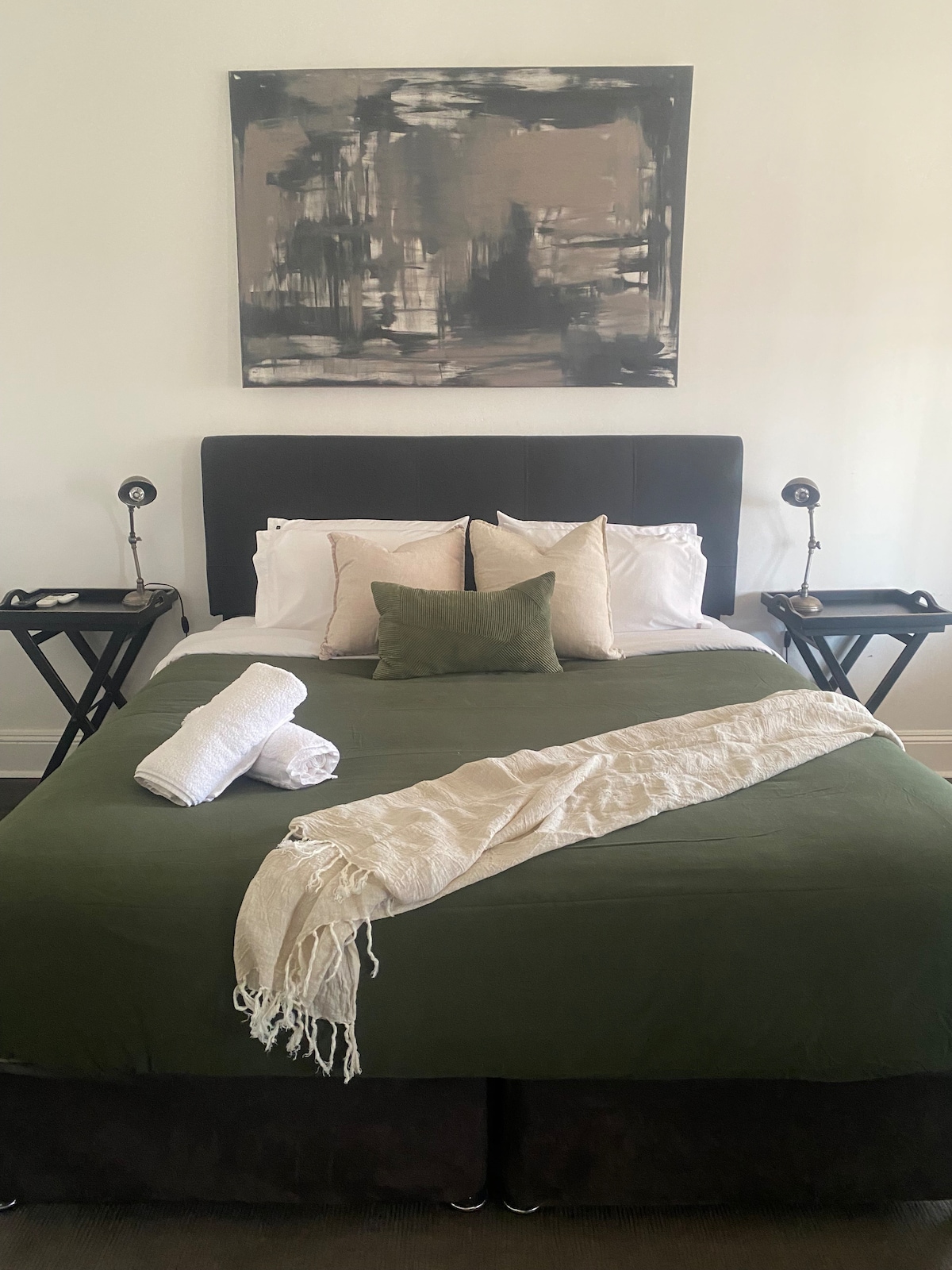 Large fully self-contained house with a queen bedroom complete with ensuite and parents sitting room, 1 double bedroom and 5 dorm style single rooms with bunk beds. Each room has it's own air conditioning. Ideal for large groups with 4 bathrooms complete with shower and toilet plus 2 extra toilets. Outdoor pergola with BBQ facilities. Close to main shopping area, next door to school oval. Ample secure parking with a large enclosed back yard. Pets must be agreed upon prior to booking.