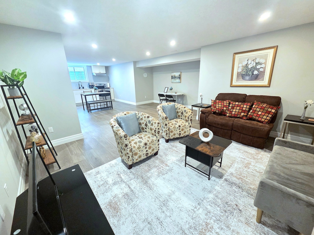 Located steps from the Pinery provincial park entrance We offer a lovely private basement suite with it's own entrance. Fishing, hiking, bike riding and many more activities at your doorstep. Large common rec-room with stereo, flat panel H/D T.V. Wifi, Netflix, YouTube Premium, Private bath with shower, Bedroom with Queen bed , second double mattress in living area, Fridge, Microwave. Fire-pit and large deck . Use of a natural gas BBQ, Hot Tub.Located just a 5 minute drive to the main strip