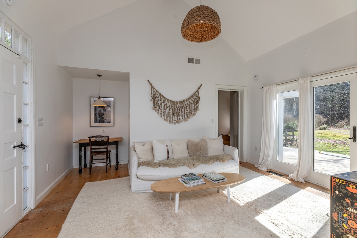 LGBTQ friendly. Our 1915 Arts & Crafts bungalow's spacious in-law suite offers driveway parking, private entrance, sunroom, king bedroom, en-suite bath, kitchenette w/fridge, micro, coffee maker, toaster. Relax in bed with 40" HDTV with Amazon Prime, HBO Max, Netflix, premium cable. Enjoy private gardens to sun, read a book or cup of coffee. Short drive to 4 Vineyards, Theater and the train station. I am not responsible for wifi.