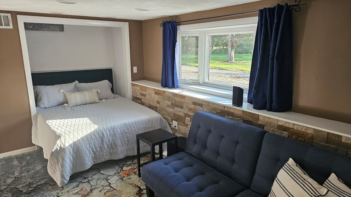 Cozy studio located on 90 acres of private property that includes conservation woodland and fields, perfect for a challenging hike and wildlife viewing. Apartment has 1 queen bed with roll out cot and a full bathroom with shower and selection of towels. The fully equipped kitchen comes with a refrigerator, microwave, and the washer and dryer downstairs mean less packing. When not out and about exploring the countryside there is WiFi and a smart TV to keep you entertained.
