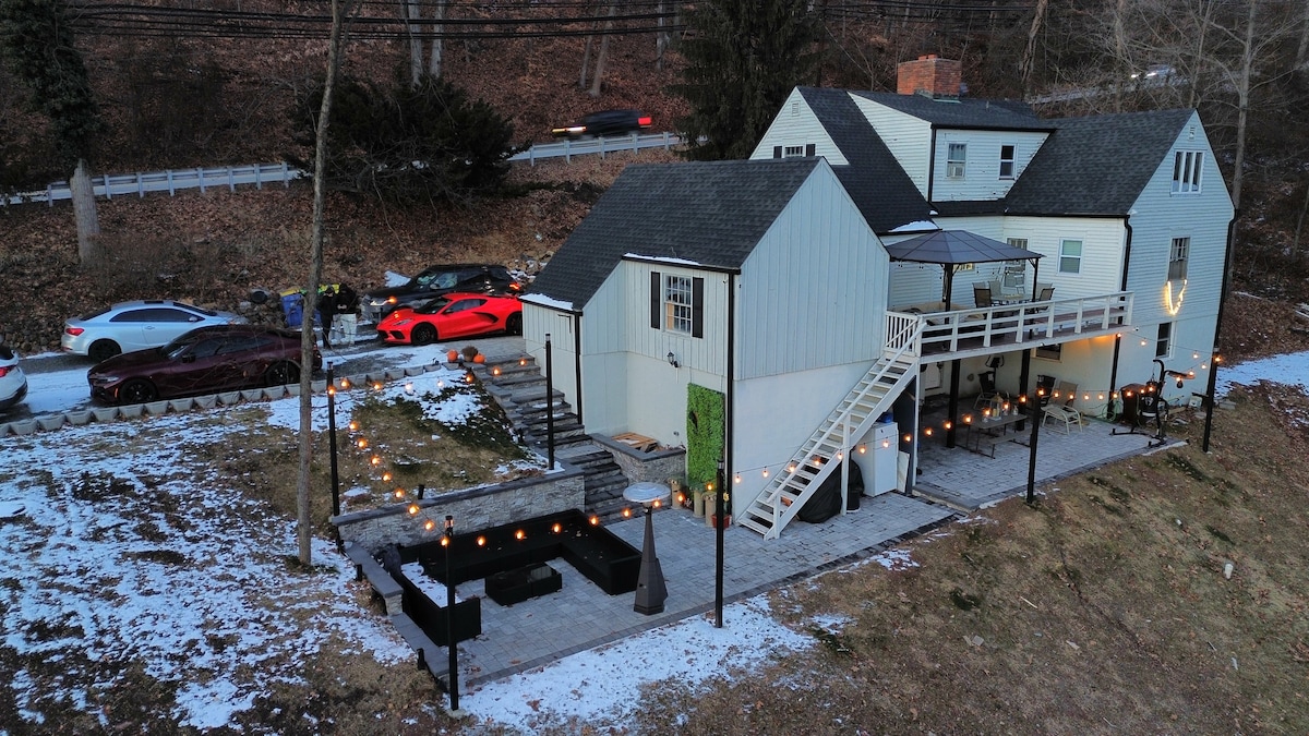 Enjoy a weekend getaway at our newly renovated entertainment center Private entrance. Street parking & 1 car driveway. 1,000 mbps Wi-Fi speed. Home Movie Theatre with 100 inch+ projector. Sound System in ceiling. Custom Bar, with quartz countertops and tile finish. Full service kitchen with appliances (range, microwave and fridge). Backyard access with patio, seating & grill. Complementary snacks, drinks, robes w/ slippers. 15 min EWR, 30 min NYC