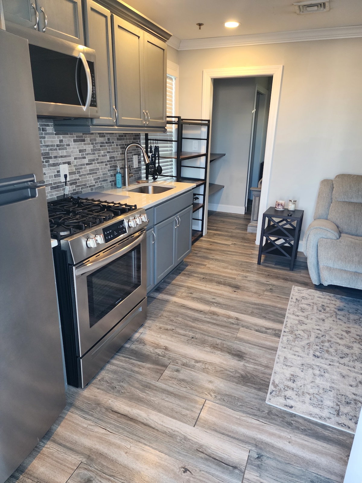 The Captain's Cottage is in an awesome location in the back of a property that is across from the waterfront park along Shark River. Paddle-board/kayak rentals, fishing piers, charter boats, mini-golf, and Belmar's newest waterside restaurants are right across the street. Waterfront views from the yard and one of the best sunsets at the shore! Includes 2 person kayak, 2 bikes & 2 beach badges! Perfect shore weekend getaway for couples or small group of friends. 1 mile to ocean. Short Uber, bike, or train ride to Asbury Park. Also, please note that there are two houses on this property, both are rental listings. Privacy is no concern... the two houses, their addresses, yards, and parking are all separated. However, the driveway entrance is shared. This listing is for the back house on the property. The Captain's Cottage is in a very unique location for Belmar. In the past few years, the Belmar Marina area has gained popularity as park spaces, waterfront walkways, fishing piers, and new bars and restaurants have opened up along the Shark River. 9th Ave Pier and Marina Grille have been a big hit, where you can enjoy a waterfront meal and drink while watching the beautiful sunset. Fishing charter boats, mini golf, parasailing, kayak/stand-up paddleboard rentals are also available in this area. The home is still close to Main Street and roughly one mile to the ocean. As an alternative to the ocean, there is also a free beach along Shark River directly across the street from the home. It is also a short Uber, bike, or train ride to Asbury Park. Parking: Two cars can fit in the space assigned, and additional parking is available for no cost at the adjacent side streets (K or L Street). The Belmar Train Station and Belmar Main Street is a short walk. It is one mile from the ocean and there is also a free public beach right across the street along the Shark River. A very short Uber, bike, or train ride to Asbury Park. Please be mindful of the shared driveway entrance and parking assignments.
