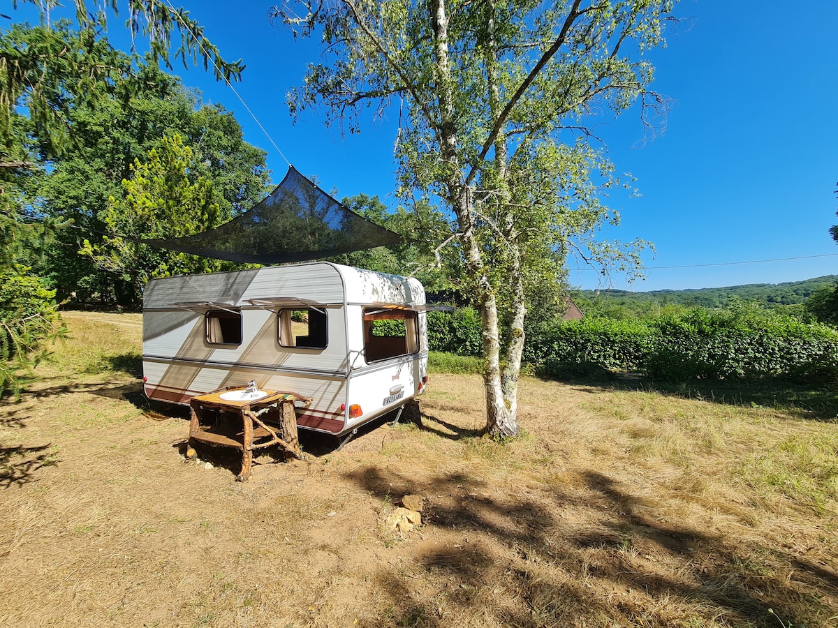 The Caravan is set on the edge of the Village, a 10 min walk to the Centre, in a calm and shady area, 50 metres away from the River (a nice place for a swim). Ideal for up to 4 guests with space to feel at one with nature. For that special experience in a unique setting, we have kept everything original whilst providing as much comfort as possible. The price is based on 2 Adults, with up to 2 children free. For a single guest (no Children), please enquire for a 'Discount' before booking.