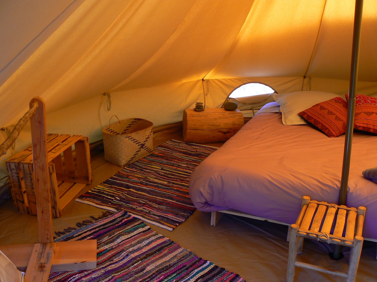 MICA, tente équipée tout confort 12 m² pur coton, rivière à 5 min à pied. Un lieu hors du temps. Sur le même lieu LA COLLINE VAGABONDE : 1 autre tente, une cabane sur pilotis, 1 maison indépendante. La tente, installée à flanc de colline entre pins et châtaigniers. Belle rivière à 5 minutes de marche. Ici nous vivons simplement et en harmonie avec la nature, nous aimons aussi confort et propreté. Cuisine équipée partagée, eau courante et chaude Salle d'eau et WC sec partagés par 2 couples max.