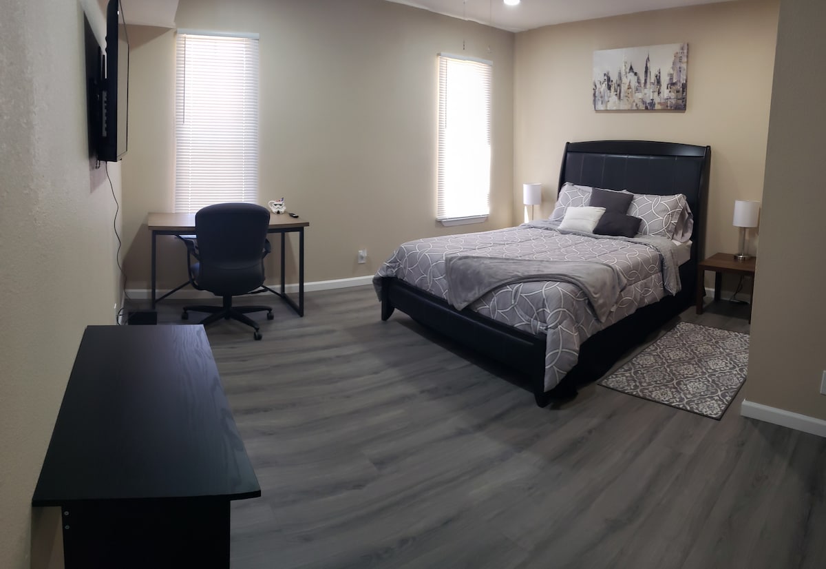 Spacious 1BR 1 bath condo with open floor plan for kitchen/dinning/living room. Our unit is newly renovated, and offers free Wi-Fi. new appliances, and microwave, fresh linens and towels, as well as extras located in closet with iron/ironing board. Bedroom has Queen bed , desk, and each room has Amazon Fire smart TV w/ remote to access multiple streaming apps. A small patio is located off living area where parking lot is clearly visible to see your vehicle. Laundry on-site short walk away.