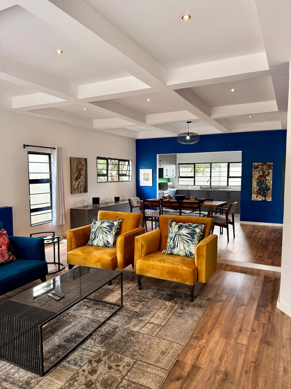 Set in a dramatic garden, this guesthouse has all the comforts with an artsy flair. The cottage is fully equipped includes a kitchen and lounge, sun deck, private garden, two bedrooms and two bathrooms. The cottage is family friendly, tastefully furnished with local antiques and up-cycled materials. A comfortable base for business, visiting relatives or exploring. Large silent generator. Wifi &DSTV. We love hosting families.