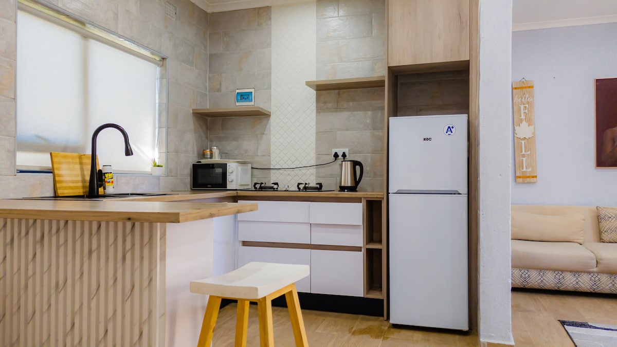 This unique place has a style of its own. Enjoy your stay in this compact studio apartment designed for sleeping, eating & dining. The kitchenette is fully equipped with a gas hob, mini fridge, & microwave. There is a separate bathroom with a shower. TV with DSTV (cable TV) is available, as well as wifi access. For backup electricity, there is a solar system The studio apartment is attached to the main house, with its own outside entrance, & parking on site.