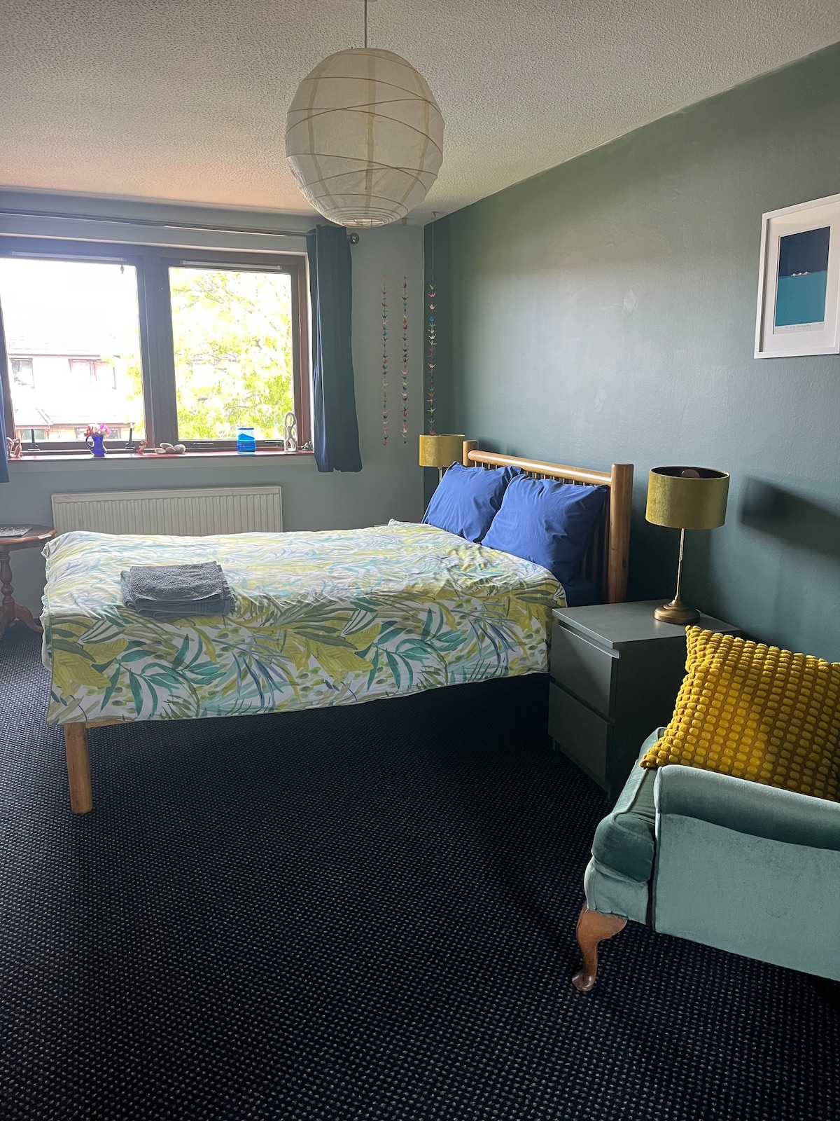 My home is a 2 bedroom ground floor flat on a quiet residential street in Gorebridge, a town with good train and bus links to Edinburgh and the Borders. There is on street parking. The bedroom has 2 single beds, table and chair suitable for laptop working and ample storage space. A kettle and tea/coffee are provided. The bathroom has a shower, towels are provided. There is a large garden with eating area which guests are welcome to use. A keysafe entry system allows for easy access.
