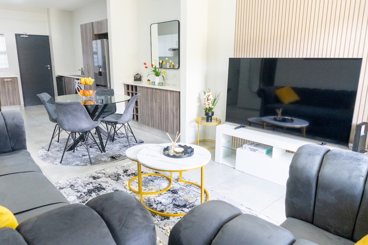 Riviera Château de Rêve – Phoenix's Gîte @ Ellipse Waterfall. Luxury 2-bedroom apartment with breathtaking views, spacious living, top-tier finishes. Features: balcony with comfy chairs, sliding doors, Smeg kitchen, 75" Smart TV, Disney+, Netflix. Amenities: Life Day Spa, TriFit Gym, Luna Club, gyms, parking, fast wifi. Near Mall of Africa, Netcare Hospital. Business & leisure blend in a vibrant community with iconic architecture & luxurious amenities. Lifestyle exceeds expectations 😊