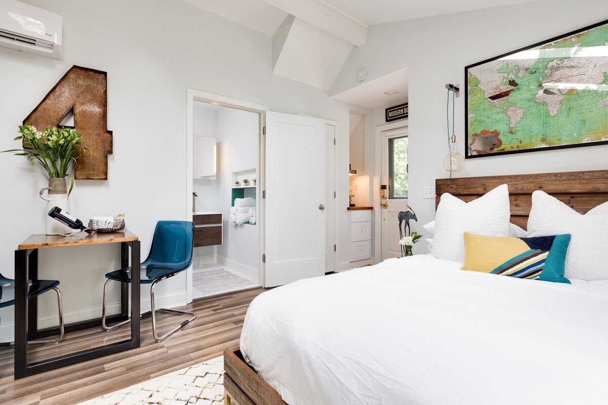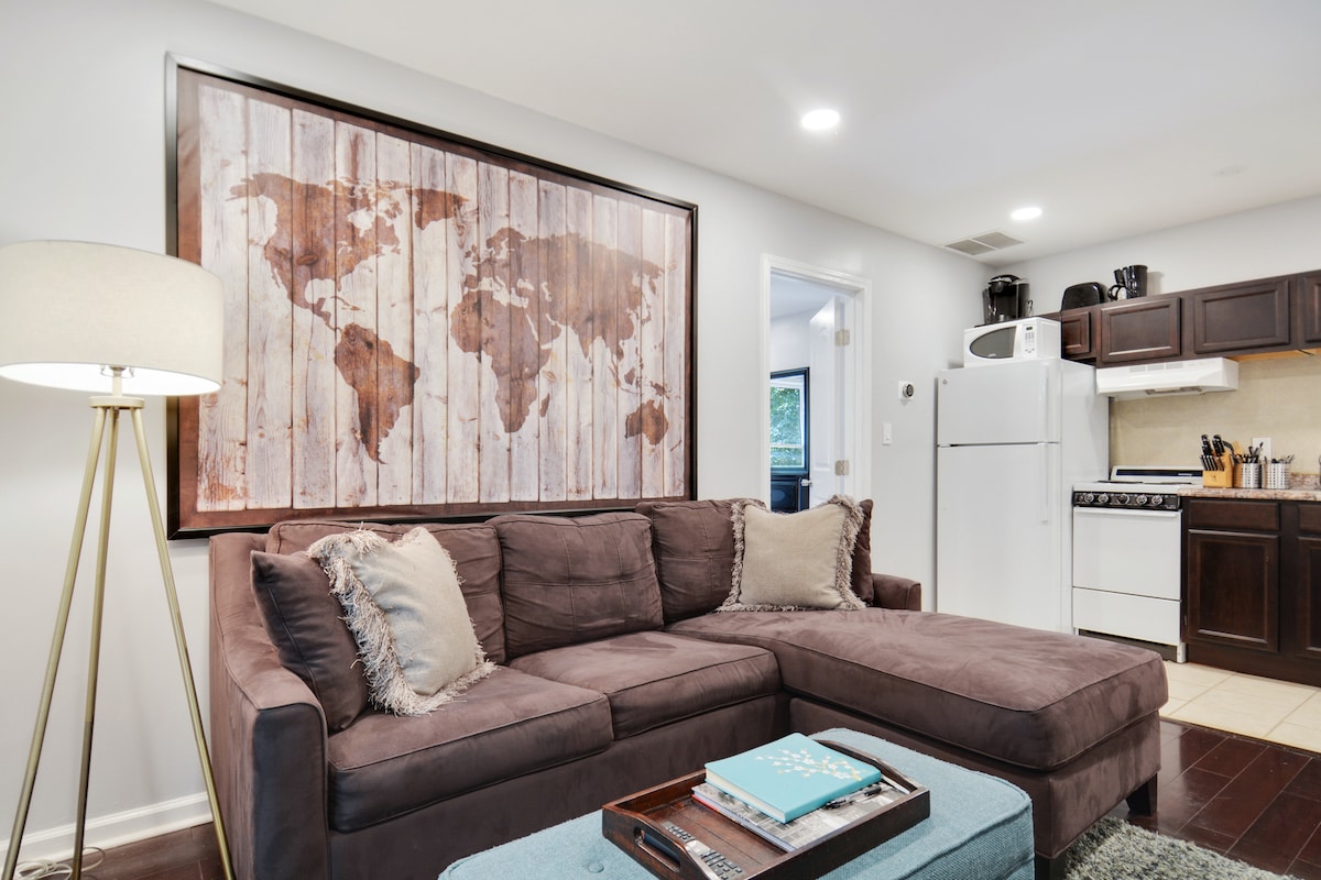 The carriage house was originally constructed in 1927 and lies tucked behind our main house on the high side of a private, yet very accessible street. A short walk up our driveway brings you to a stone staircase that provides entry to the the screened-in porch and front door to the cottage. There are twelve steps, so this might not be the best place if you have trouble getting around. A back door to the house opens directly to a small patio for your private use. The shared, flat, landscaped back yard is shaded by a 150-200 year-old giant oak tree (this tree witnessed the Civil War up and close!) and features a large fire pit with plenty of seating that you are welcome to use with prior arrangement. The setting becomes quite special on cool fall and winter evenings when the vantage point provides clear views of the Midtown skyline.