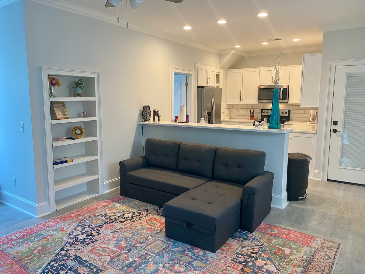 Just 10 mins off of route 77, Fort Jackson & Downtown COLA only 20-30 min drive. Studio’s located in a beautiful family-friendly, suburban Lake community in Columbia SC with grocery stores & gas stations within minutes. Enjoy a night in equipped with movie screen & projector, then finish the night by melting your worries away into an incredibly soothing king size memory foam bed. Let our all-in-one washer/dryer do the work for you and wake up to a finished cycle and sounds of SC’s native birds.