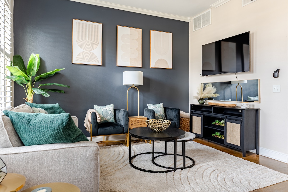 Masterful design and modern elegance are uniquely embodied in this getaway. The home offers an open layout, chic furniture, bright neutral and contrasting colors with an overall modern aesthetic. ✔ Located in the heart of Montrose, mins from downtown/midtown ✔ Walkscore of 91 - You can travel everywhere on foot! ✔ Sleeps 5+ guests on 2 king beds & a sectional sofa ✔ 75" Smart TV with FREE Netflix, Hulu, Disney+, ESPN ✔ High speed 1Gbps Fiber Wi-Fi Internet ✔ Free Reserved Parking in Private Lot
