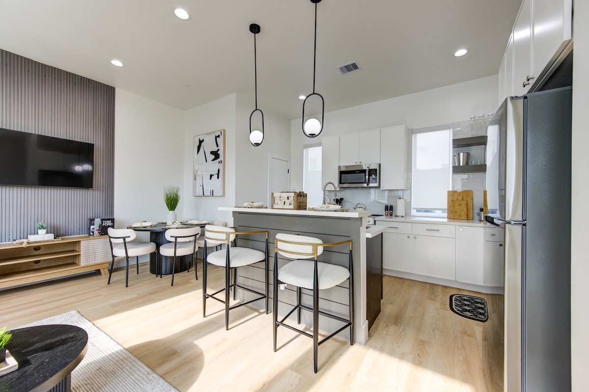 Take it easy on the covered 2nd-story patio, then hang out in the open kitchen and dining space under exposed ducts and dramatic black rafters. The double shower head glossy white bathroom and ghost chairs add a futuristic edge to this urban abode's loft vibe. Unwind on the acclaimed ultra deep sectional with a plush blanket and catch up on your favorite shows or movies. Many points of interest are reachable within minutes.