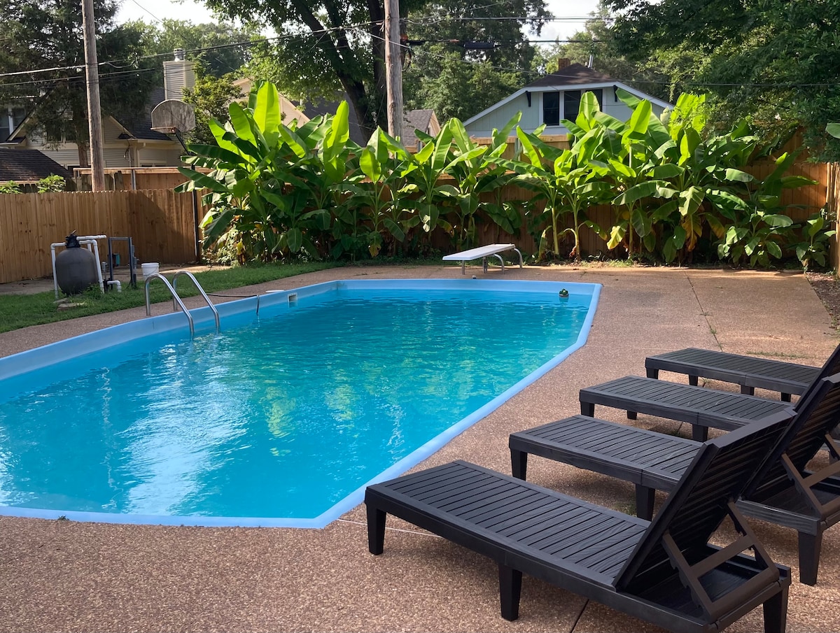 This newly renovated 6-bedroom home in Memphis has EVERYTHING you need for a southern blues getaway! *2.8 miles to Beale St *10 minutes to Graceland *Large pool *Loungers *Outdoor TV, Fridge, BBQ, and wet bar *Pool table, ping pong, & air hockey *Gym with treadmill, yoga mat, and weights *Family friendly- pack n play & high chair available *Fire Pit *Fully stocked kitchen *Outdoor dining *Smart TV's in living room & every bedroom *Porch Swing *Deck- perfect for remote workers *High s