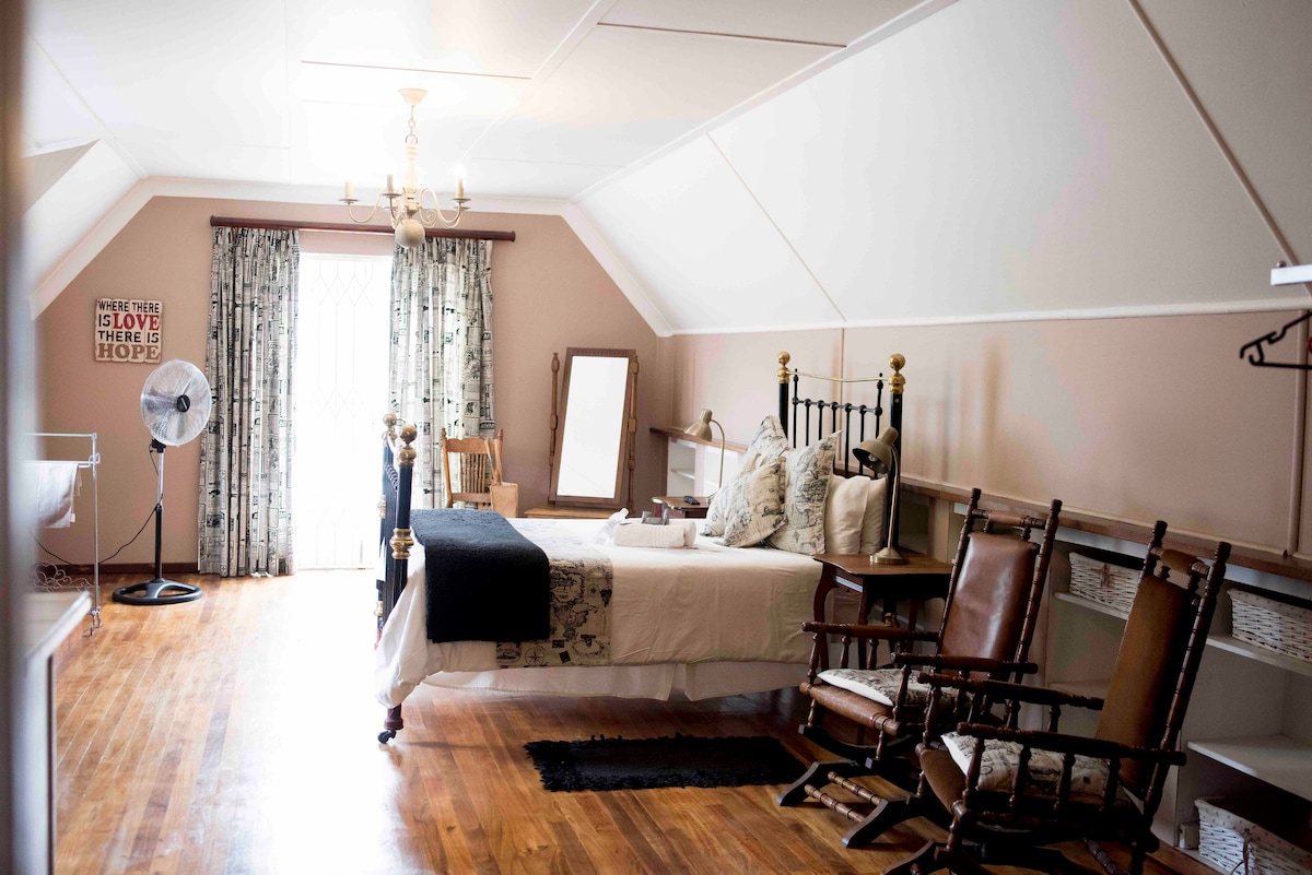 Solar-powered, your suite is 1 of 3, side-by-side, in a garden courtyard behind our 1917 Cape Dutch heritage home. Expect safe gated parking, an en-suite with shower, Netflix, free WiFi, own patio and kitchenette with a small fridge, microwave, and kettle, and a shared barbeque area. You can add breakfast, pre-arrange dinner, or enjoy a drink in our Victorian Boho home and small pub (when open). You are free to enjoy the garden and outside areas, which include a barbeque courtyard.