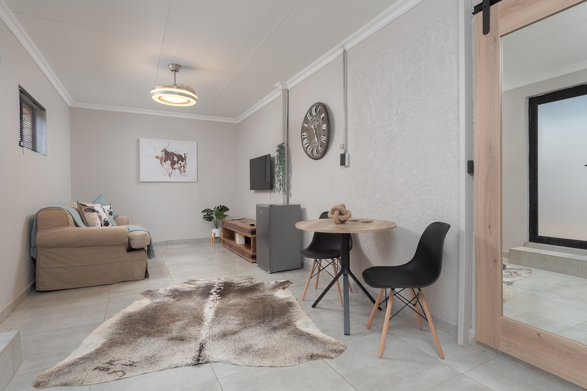 Situated in Brackenhurst,Alberton. Step into a modern and spacious 40 sqm self catering unit. Kitchen fully equipped with a stove, oven, microwave, fridge and a washing machine. An open plan lounge with a comfortable couch. Wi-Fi, 32'TV with Netflix. The bedroom has 2 single beds & build in cupboards. The bathroom has a huge walk in shower, basin & toilet. Parking is behind a remote control gate with enough space for 2 cars. Relax around a sparkling swimmingpool or sip on a drink under the lapa.