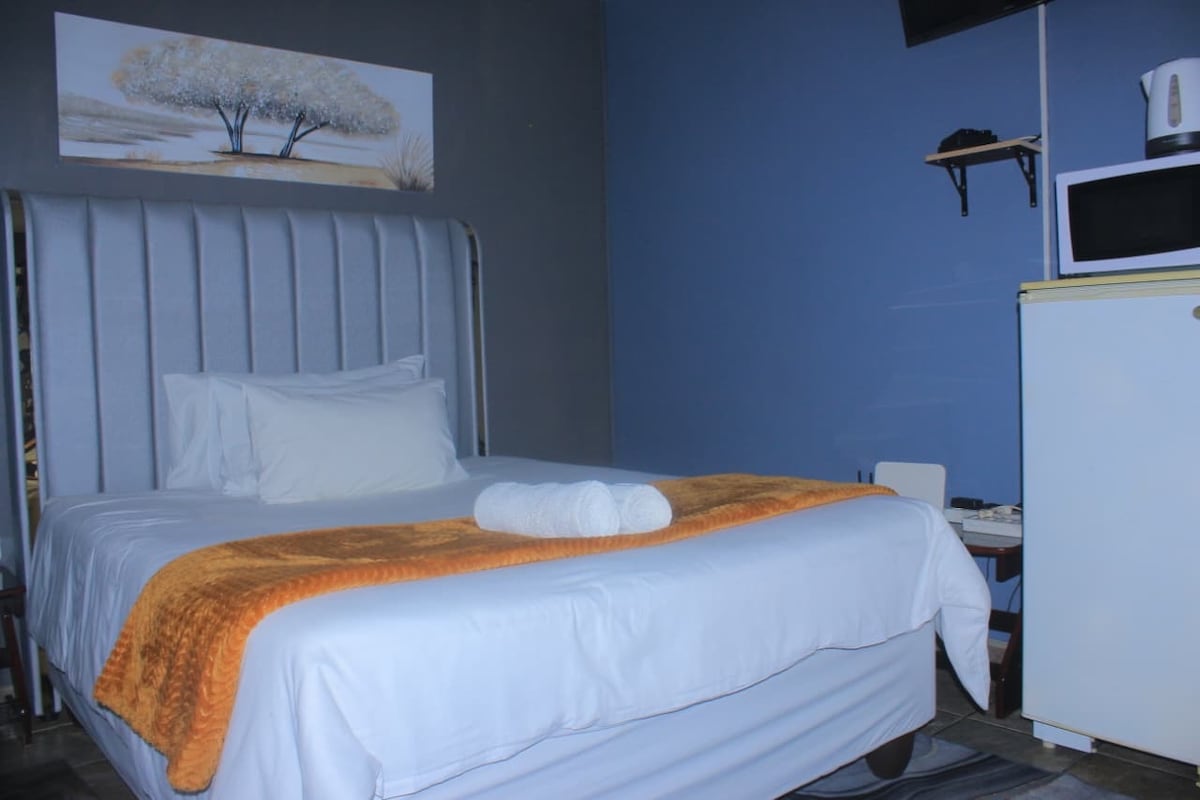 Dubble bed. 3rd bed can be arranged for child under 17 years of age If this room is not available we have the right to give you another room, bathroom, Wi Fi , Kettle, Fridge, Microwave. Bring water to drink. The Room to be cleaned when you leave. Weekly bookings to be cleaned once a week. We can not take responsibility for Load shedding or Wi fi disruptions Pool NOT for guests use. We have the right to change rooms if necessary. Close to: Maccauvlei Golf Course Riversquare Midvaal hospital
