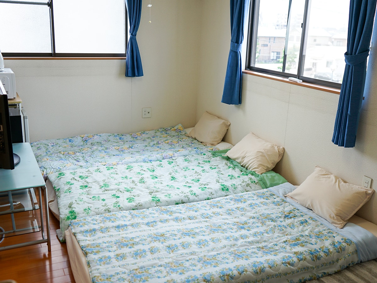 ゲストハウスの2階に位置する、3名様までご利用可能なお部屋。 布団3組でお休みください。 お部屋の2つの窓からは明るい光が差し込み、温かな雰囲気。 自然の光で朝の目覚めもこれでバッチリ ー・ー・ー・ー・ー・ー・ー・ー・ー・ー・ー・ー・ー・ー・ー・ー・ー 以下の時間帯はスタッフが不在となるため館内でのご滞在はいただけません 【10時00分 から 17時30分】 ご理解とご協力をお願いいたします ー・ー・ー・ー・ー・ー・ー・ー・ー・ー・ー・ー・ー・ー・ー・ー・ー ■寝具:布団3組 ■設備:テレビ/冷蔵庫/電気ポット/エアコン/無料Wi-Fi/ベッド近くにコンセント ■アメニティ:タオル/バスタオル/スリッパ ■角部屋 〈共同バスルーム〉 ■女性専用バスルーム:バスタブ付 ■男性専用シャワールーム ※利用時間:~23時/5時~ 〈共同スペース〉 ■リビング テレビ/ダイニングテーブル ■キッチン 冷蔵庫/電子レンジ/電気ポット/炊飯器/IHコンロ/調理器具/食器/カトラリー/コップ