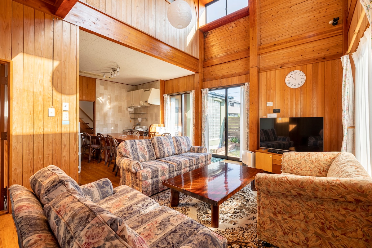 Entire Home Rental – 130㎡ / (3LDK) for up to 15 guests. Enjoy a relaxing stay surrounded by mountains and bamboo, with a private garden perfect for BBQs and bonfires 😊 Even on rainy days, you can BBQ in the covered backyard area. Guests also enjoy experiences like firewood chopping, meeting friendly animals, and cozy evenings by the wood stove in winter—an easy way to enjoy a bit of the camping spirit.