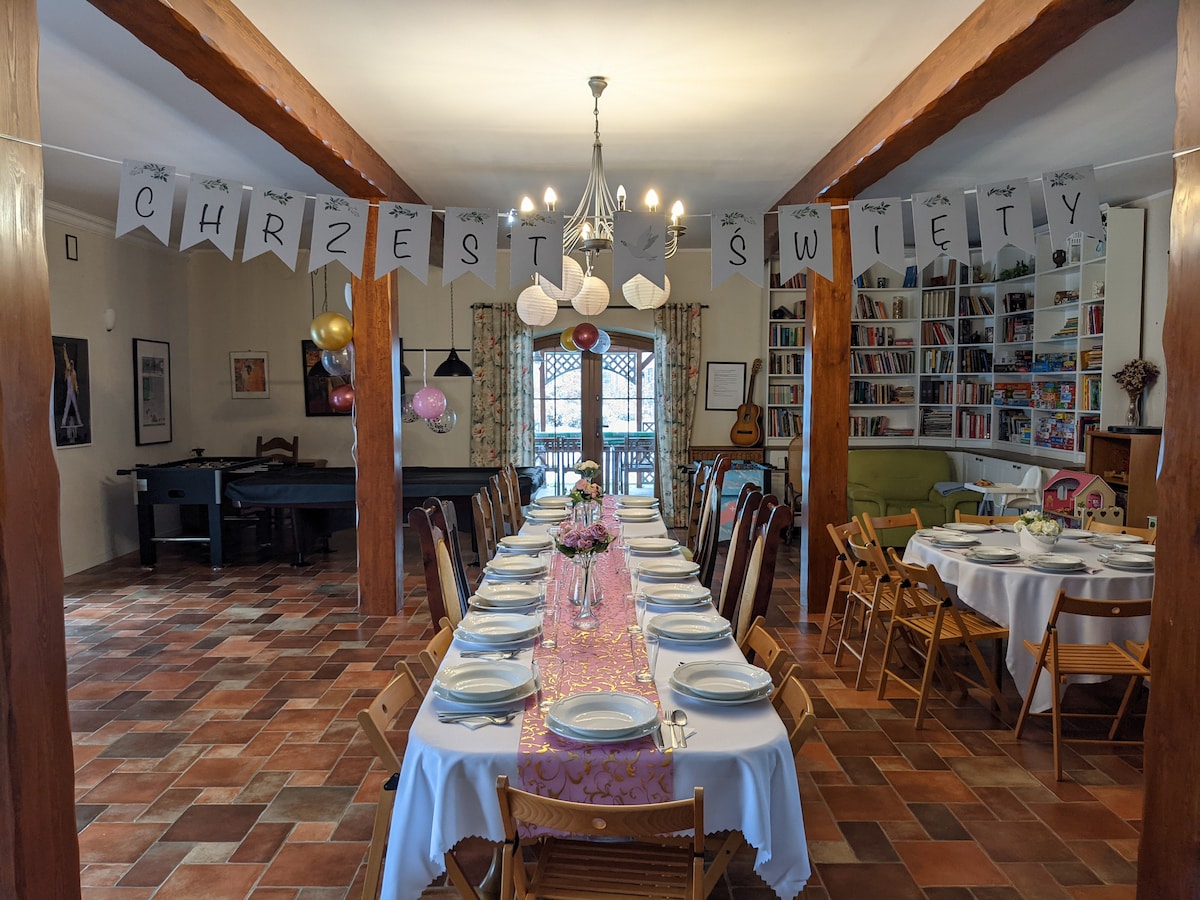 Kuchnia jest w pełni wyposażona. W salonie jest zestaw wypoczynkowy wraz z TV oraz dekoderem a także router z WIFI. Do Państwa dyspozycji jest również taras z meblami ogrodowymi i grillem,suszarka do włosów i ręczniki. Nie wynajmujemy domu na wieczory panieńskie i kawalerskie oraz inne uroczystości okazjonalne typu urodziny etc.Nie akceptujemy zwierząt. Zakaz palenia papierosów i e-papierosów oraz innych wyrobów tytoniowych.Przy przyjeździe pobierana jest kaucja zwrotna w wysokości 500 zł.